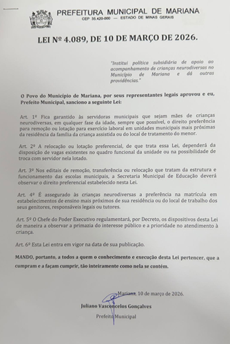 A Prefeitura de Mariana aprovou, nesta data, a Lei nº 4.089, que institui uma política subsidiária de apoio ao acompanhamento de crianças neurodiversas no município. A assinatura do documento também foi realizada hoje, e a lei será oficialmente sancionada após sua publicação no Diário Oficial do Município.